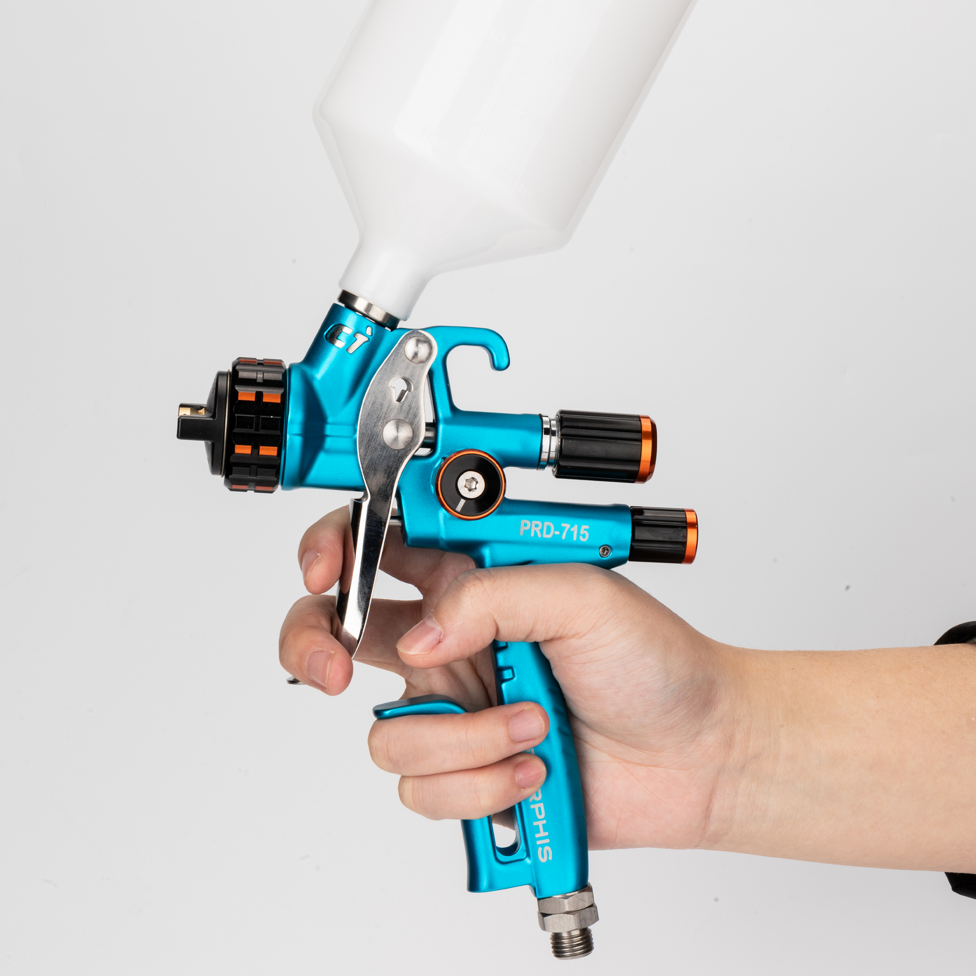 Atomisation Fine et Uniforme (Technologie LVLP) : Le PRD-715 utilise la technologie LVLP (Low Volume Low Pressure), ce qui signifie qu'il fonctionne avec un volume d'air faible et une basse pression. Cela se traduit par une atomisation exceptionnellement fine et une distribution uniforme des particules de peinture. Vous obtenez ainsi une finition lisse, sans défauts, idéale pour les couches de base, les vernis et les applications de précision.