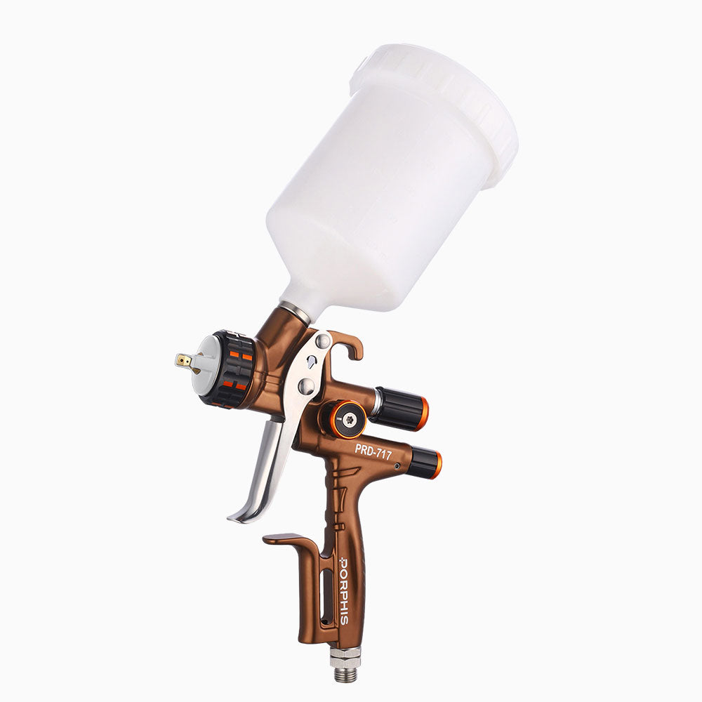 Atomisation Ultra-Fine et Homogène (Technologie HVLP de Pointe) : Le PRD-717 intègre une technologie HVLP (High Volume Low Pressure) avancée, conçue pour maximiser l'efficacité de transfert tout en produisant une atomisation d'une finesse remarquable. Cette caractéristique essentielle assure une finition lisse et uniforme, sans traces de pulvérisation, idéale pour les vernis, les couches de base et toutes les applications exigeant une haute qualité visuelle.
